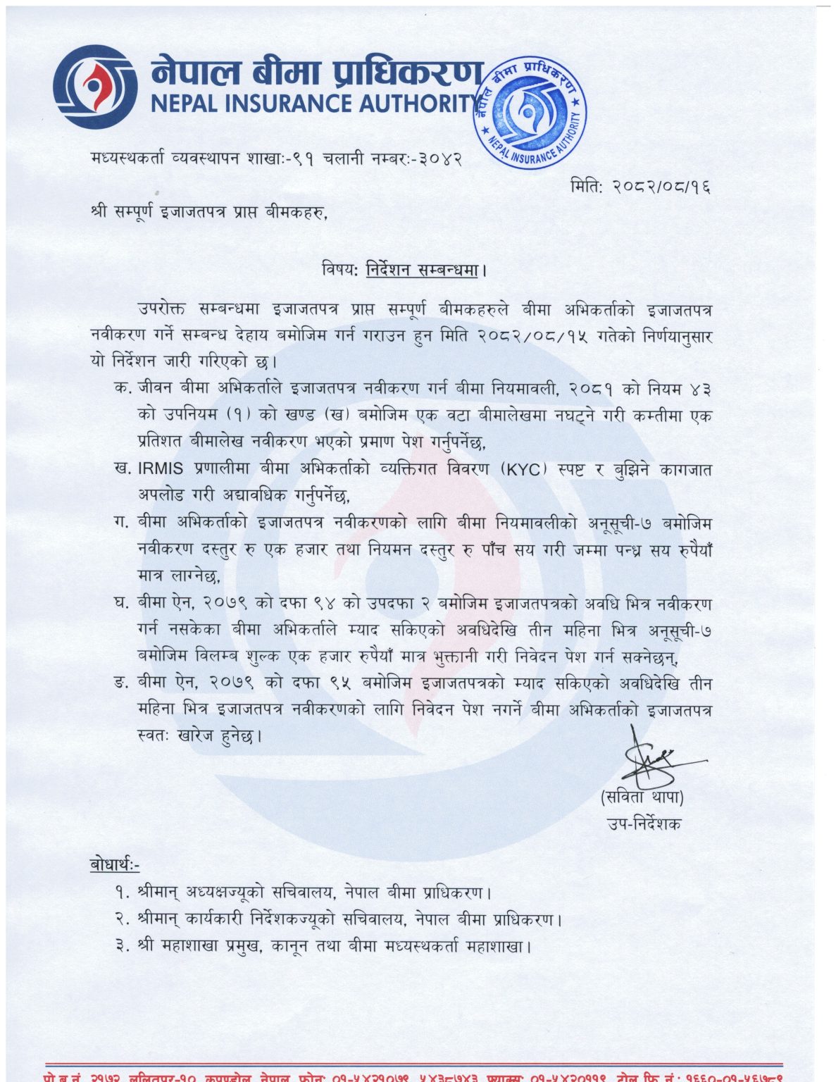 प्राधिकरणले सम्पूर्ण इजाजतपत्र प्राप्त बीमकहरुका नाममा परिपत्र जारी गर्दै बीमा अभिकर्ताको इजाजतपत्र नवीकरणका लागि उक्त ५ बुँदे निर्देशन कार्यान्वयन गर्न निर्देशन दिएको हो। प्राधिकरणको मंसिर १५ गतेको निर्णयअनुसार यो निर्देशन जारी भएको हो।