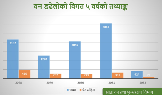 वन तथा भू–संरक्षण विभागले उपलब्ध गराएको तथ्याङ्कअनुसार २०७८ चैतमा ४६६ वटा डढेलोका घटना दर्ता भएका थिए । यो सङ्ख्या २०७९ चैतमा घटेर २६७ मा झरेको थियो । २०८० चैतमा २४९ र २०८१ चैतमा पुनः बढेर ३३१ पुगेको थियो । २०८२ चैतमा भने हालसम्मकै थोरै ७९ वटा मात्रै डढेलाका घटना दर्ता भएका छन् ।